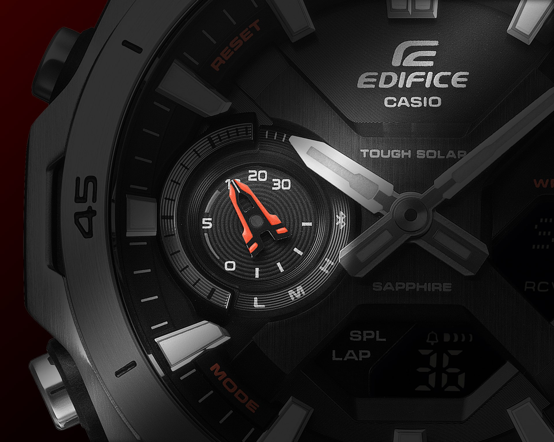A closer look hints at improved wearability. Despite its motorsport-inspired frame, the ECB-2300 wears slimmer than earlier Edifice EQB models. The analog-digital layout is cleaner too, with a compact digital window that sits less recessed than expected, making at-a-glance checks easier. From the side, the black variant’s matte ion plating contrasts nicely with polished screw accents on the bezel, elevating the overall fit and finish.