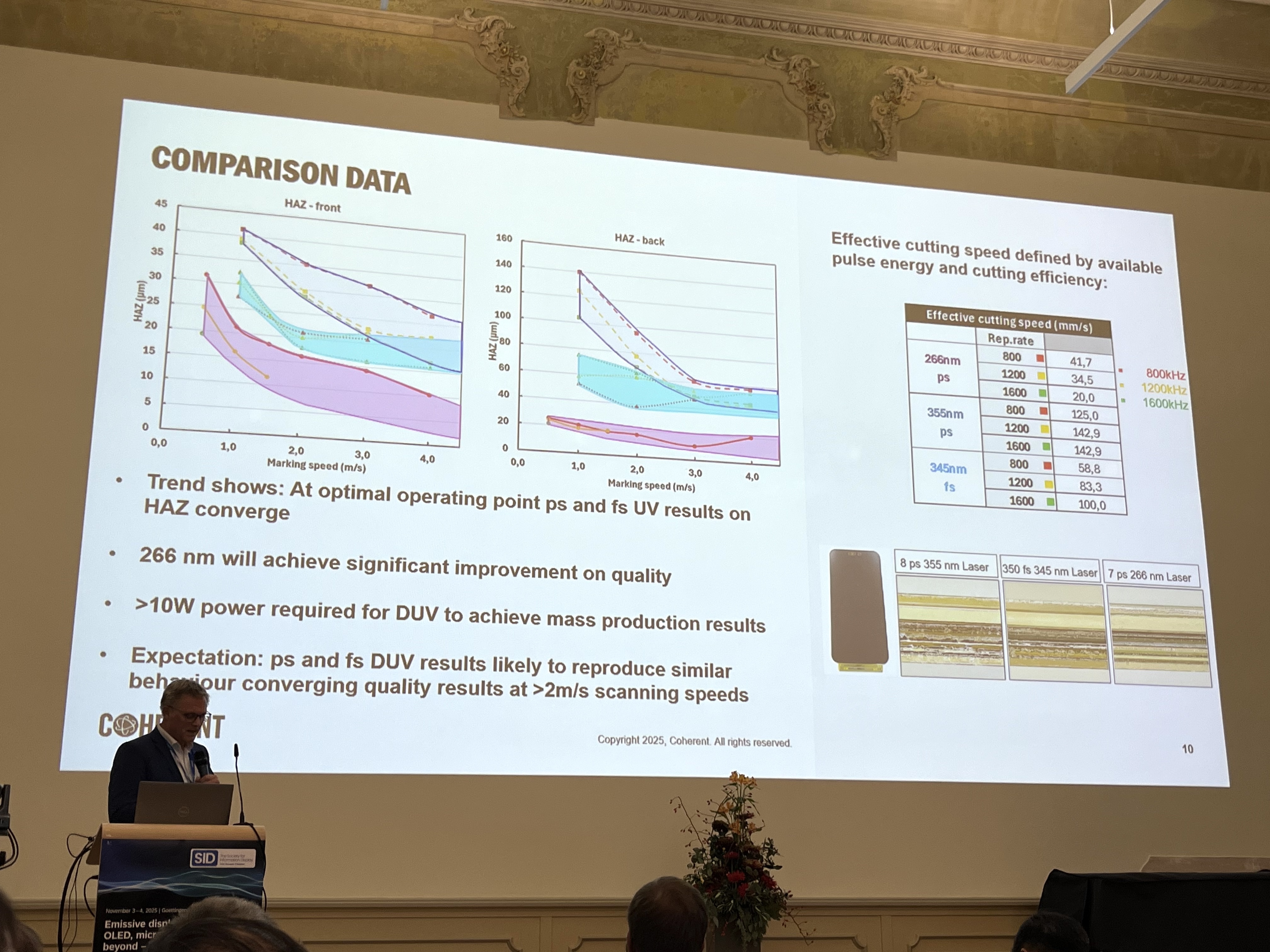 Coherent is addressing that problem with deep-UV lasers. The company, based in Göttingen, already supplies key tools for display production, including laser annealing systems used early in the manufacturing process. Its next focus is the final cut. Tests highlight why wavelength matters: at 355 nm, a common UV laser, the cut looks uneven and the layers at the separation edge are not cleanly divided, making a border unavoidable. Moving to 345 nm improves the result, but not enough for a truly bezel-free finish.