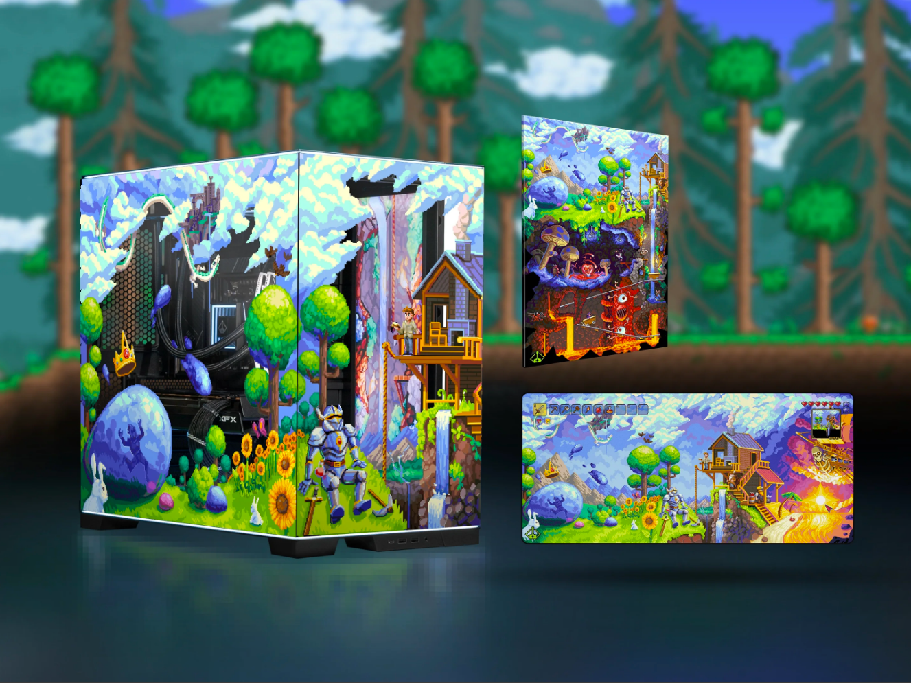 Complementing the case, Starforge has also released a Terraria-themed acrylic wall art panel and a sizable 900 x 400 mm desk mat. The entire bundle, which includes the case, wall art, and desk mat, is priced at $399.99. While this might seem steep, it’s worth noting that the standard, non-customized Lian Li O11D Evo RGB case retails at $181.99, making the bundle a unique collector’s item with significant value.